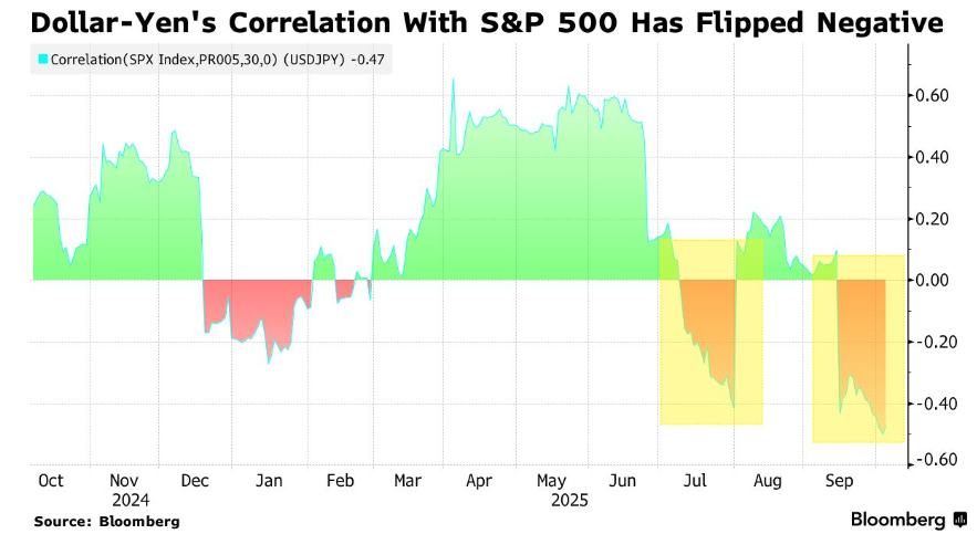 这种日元地位的变化也反映在相关性的大幅转变上。近期美元兑日元持续上行(意味着日元加速贬值)与标普500指数出现阶段性的负相关,且与日本国内政治不确定性持续上升的时期相吻合。这意味着在全球风险偏好上升时日元走强、在风险资产被抛售时反而走弱——与日元这一对冲工具应有的表现恰好相反。